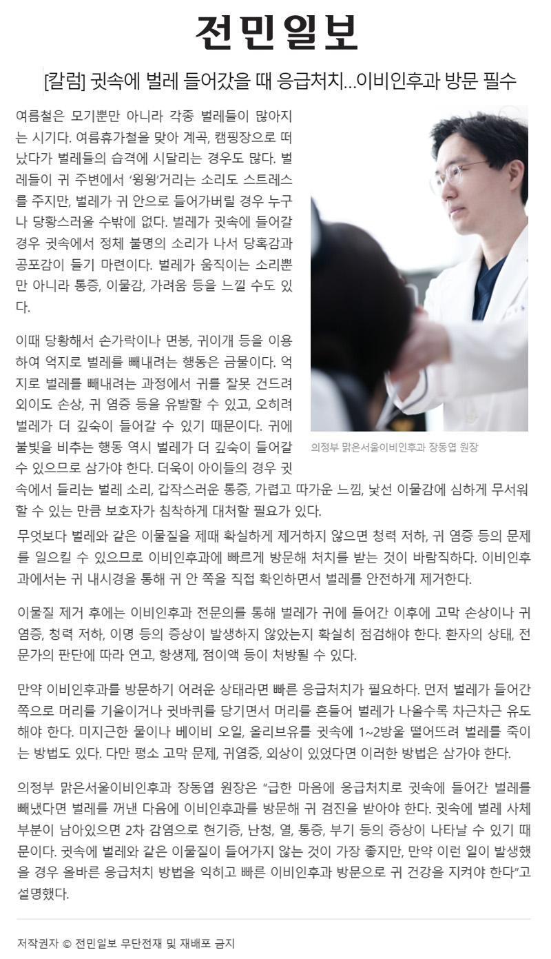 [칼럼] 귓속에 벌레 들어갔을 때 응급처치…이비인후과 방문 필수